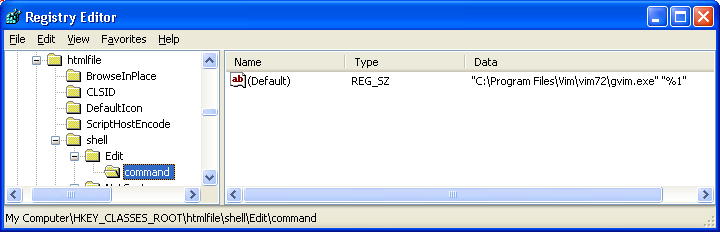 reg add HKCU\SOFTWARE\Classes\.c /v "" /t REG_SZ /d "sourcecode" /f reg add HKCU\SOFTWARE\Classes\sourcecode\shell\open\command /v "" /t REG_SZ /d "\"C:\Program Files\Vim\vim72\gvim.exe\" --remote-tab-silent \"%%1\"" /f